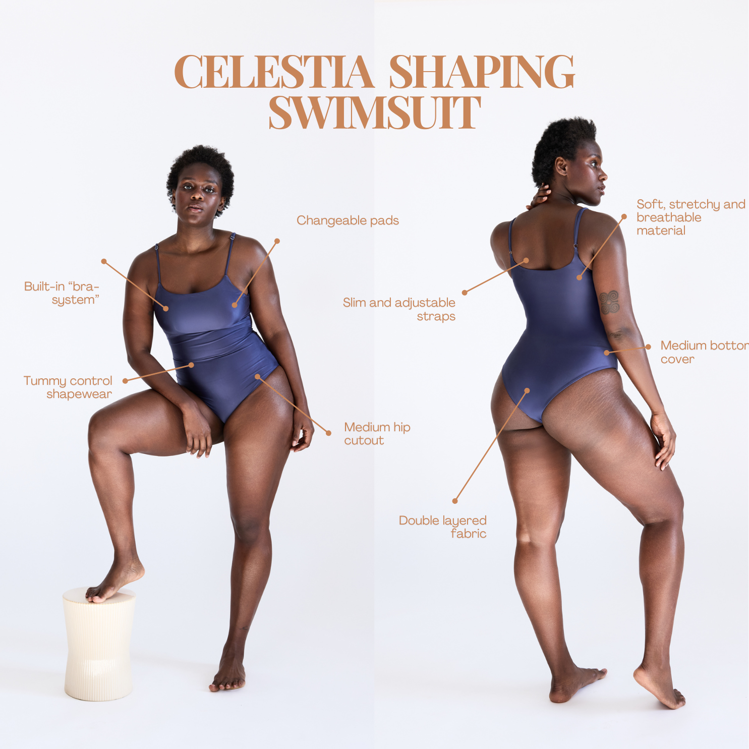 Celestia er badedragten, du tager på, når du ønsker at føle dig både feminin og stadig dækket. Med indbygget shapewear og udskiftelige pads former den blidt din krop og giver dig frihed til at bevæge dig. Den omfavner dig med elegance og masser af komfort, så du kan føle dig velklædt, afslappet og selvsikker, præcis som du er.