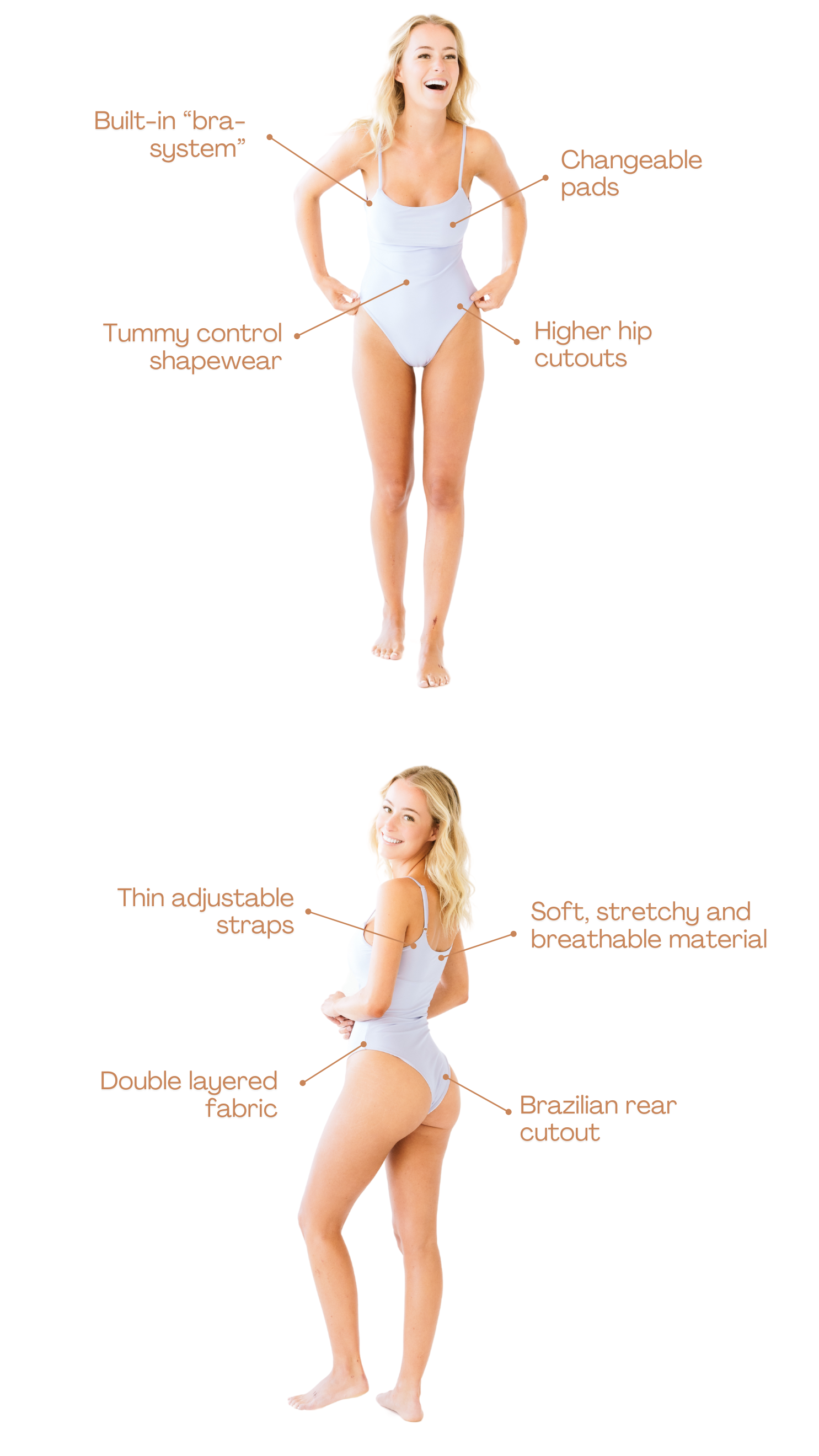 Vores materialer er blødere end noget andet man finder på markedet, samt silhuetten af badedragten er skåret med fokus på at shape taljen. Vores design er derudover designet efter at passe forskellige kropstyper og har også indbygget BH-system med pads, der kan skiftes ud. Så du kan i stor grad skræddersy badedragten til din krop.