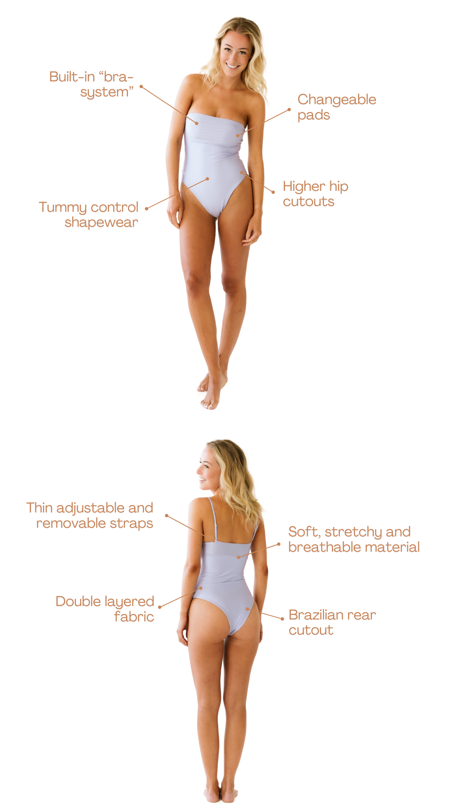Vores materialer er blødere end noget andet man finder på markedet, samt silhuetten af badedragten er skåret med fokus på at shape taljen. Vores design er derudover designet efter at passe forskellige kropstyper og har også indbygget BH-system med pads, der kan skiftes ud. Så du kan i stor grad skræddersy badedragten til din krop.